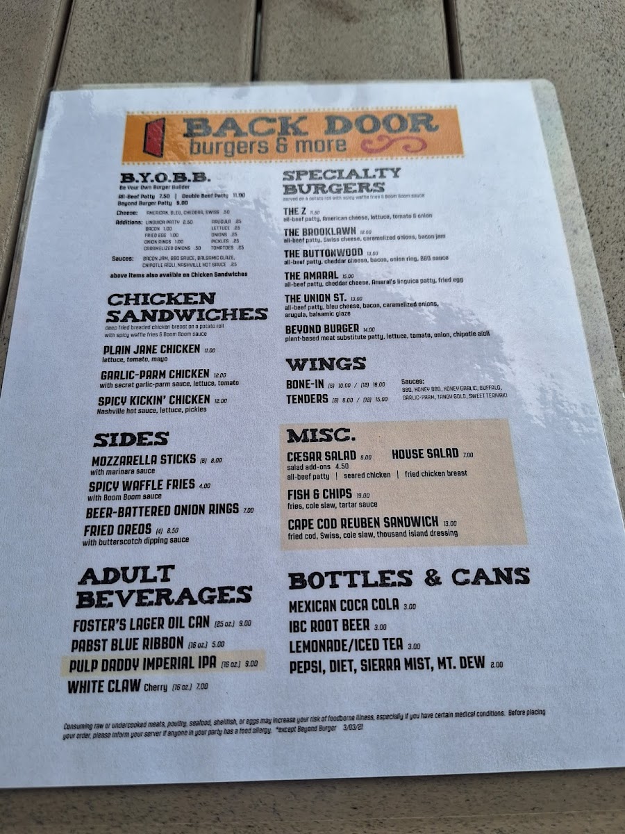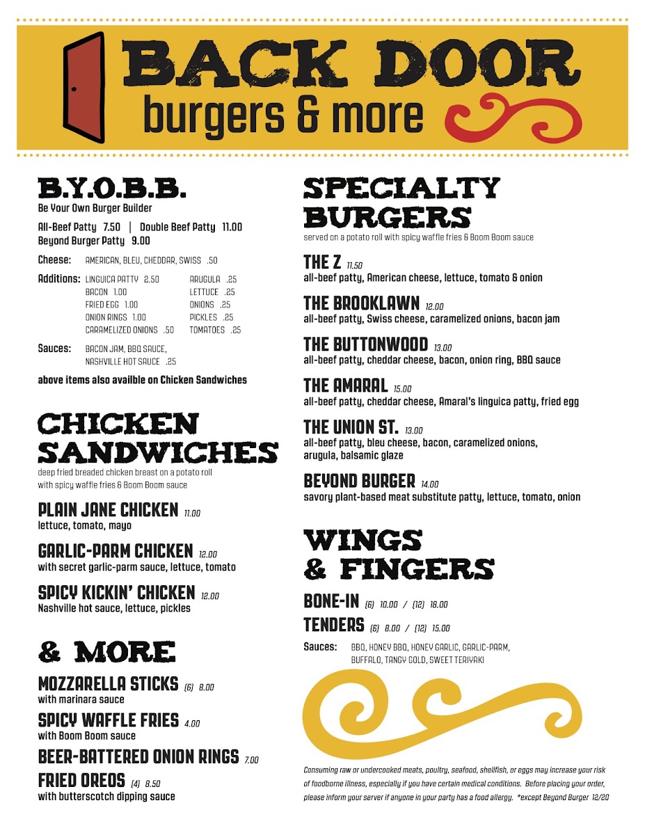 Whether you're in the mood for a light lunch or a full-fledged dinner, Back Door Burgers & More Menu delivers with its diverse range of offerings that cater to all tastes. From fresh seafood and hearty burgers to satisfying sides and tempting desserts, the restaurant ensures every meal is a memorable one. The blend of flavors and options on the menu makes it easy to return time and again, each visit offering something delicious and new.